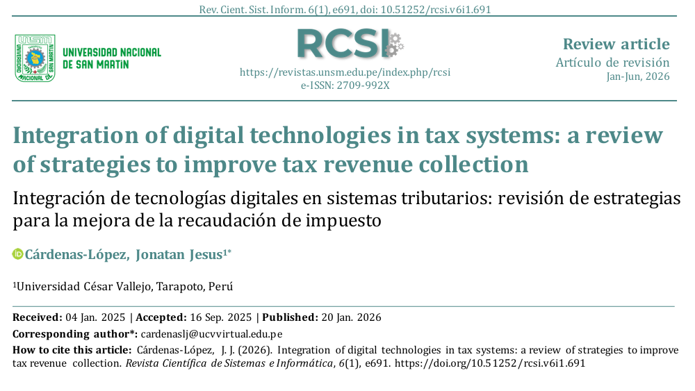 Cárdenas-López, J. J. (2026). Integration of digital technologies in tax systems: a review of strategies to improve tax revenue collection. Revista Científica De Sistemas E Informática, 6(1), e691. https://doi.org/10.51252/rcsi.v6i1.691
