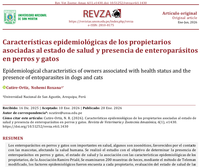 La REVZA es una publicación editada por la Universidad Nacional de San Martín, Jirón Maynas N° 177, Tarapoto, San Martín, Perú, a través del Fondo Editorial en colaboración con la Facultad de Medicina Veterinaria. Tel. (042) 480102, Web: https://revistas.unsm.edu.pe/index.php/revza, Contacto: fondoeditorial@unsm.edu.pe. Con ISSN electrónico 2810-8175 otorgado por el ISSN International Center.