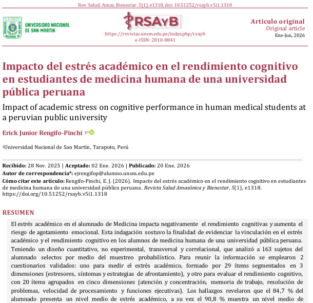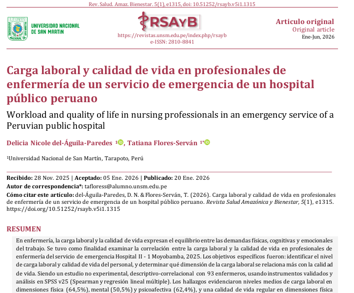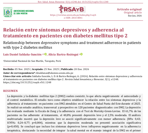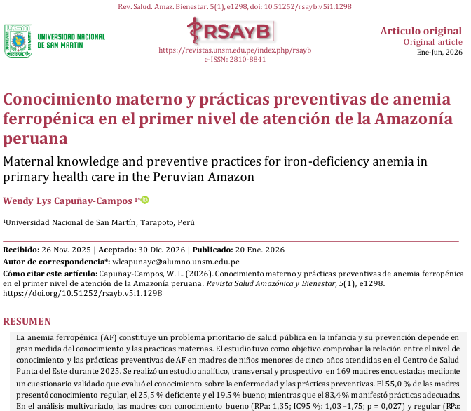 La RSAYB es una publicación editada por la Universidad Nacional de San Martín, Jirón Maynas N° 177, Tarapoto, San Martín, Perú, a través del Fondo Editorial en colaboración con las facultades de Ciencias de la Salud y Medicina Humana. Tel. (042) 480102, Web: https://revistas.unsm.edu.pe/index.php/rsayb, Contacto: fondoeditorial@unsm.edu.pe. Con ISSN electrónico 2810-8841 otorgado por el ISSN International Center.